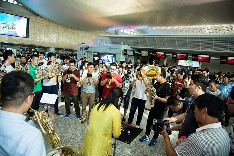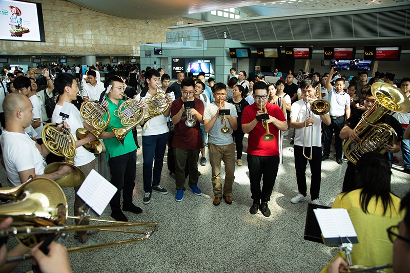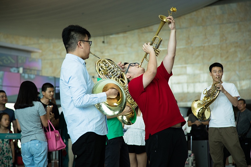 2018年7月13日,由航站區(qū)管理中心聯(lián)合杭州愛樂樂團共同舉辦的“交響樂快閃”文化活動在T3航站樓出發(fā)大廳傾情上演。下午14點,一聲清脆的小號聲拉開了活動的序幕,在人流如織的航站樓內(nèi),年輕的樂手們?yōu)槁每蛶砹艘粓銮八从械囊暵犗硎堋√枴A號、長號、大管、雙簧管等樂器一應(yīng)俱全,樂手們用自己嫻熟的技巧演奏了的《茉莉花》、《失戀陣線聯(lián)盟》、《打字機》等經(jīng)典名曲,成功引來過往旅客的駐足觀看,旅客們紛紛拿出手機拍照留戀。不少人更是陸續(xù)加入的表演活動中,令“交響樂快閃”活動現(xiàn)場變得人山人海、熱鬧非凡。(航站區(qū)中心 王源斌 朱偉)