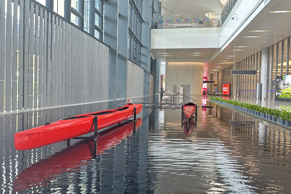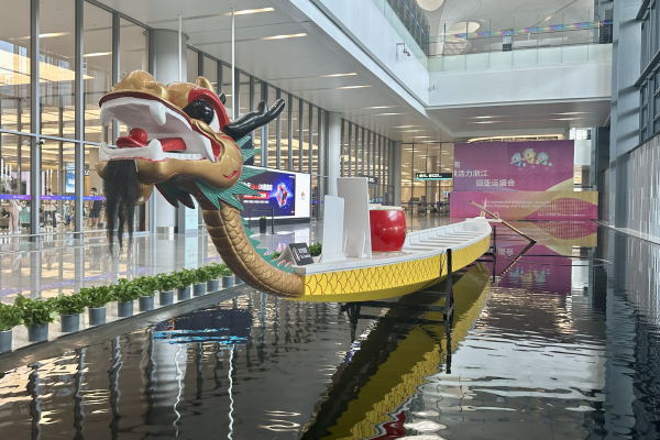 “游”進T4!杭州機場在到達層布置四艘亞運水上項目競賽船艇