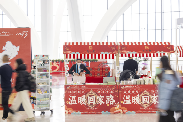 本次集市位于T4出發大廳,共設立17家年貨商品攤位,邀請浙江省知名年貨品牌及來自山區26縣的助農特色產品入駐。優質茶葉、精美年貨禮盒、普陀特色禮盒、靈隱寺文化創意產品以及各式服飾等琳瑯滿目。此外,航站區中心還結合非遺傳統文化,邀請非遺捏泥人、皮影戲、吹糖人等傳統手工藝者進行現場表演,打造濃濃年味。