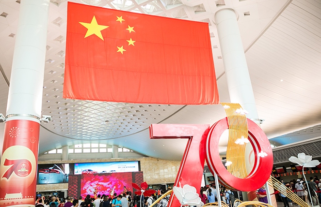 為慶祝新中國成立70周年,9月中旬,在T1、T2、T3航站樓出發(fā)層懸掛巨幅國旗、陳設國慶景觀布展,吸引了大批出行旅客合影留念,進一步充實樓內(nèi)豐富多彩的國慶節(jié)日氛圍。9月30日上午,航站區(qū)中心聯(lián)合各單位在T3航站樓出發(fā)大廳舉辦以“這一抹中國紅”為主題的國慶文藝匯演。演出現(xiàn)場精心呈現(xiàn)了歌曲演唱、舞蹈表演、樂器演繹等10個表演節(jié)目,激揚的歌聲、優(yōu)美的旋律、動人的舞蹈和有趣的知識問答互動,吸引了旅客駐足觀賞,共同慶祝新中國成立70周年,為祖國的繁榮昌盛送上最真摯的祝福。