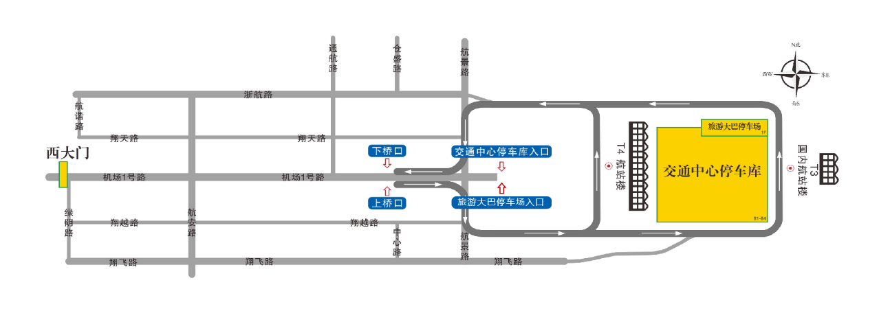 交通中心停車庫(近端):該停車庫位于交通中心B1-B4層。可沿機(jī)場1號路左側(cè)地面道路直行進(jìn)入。