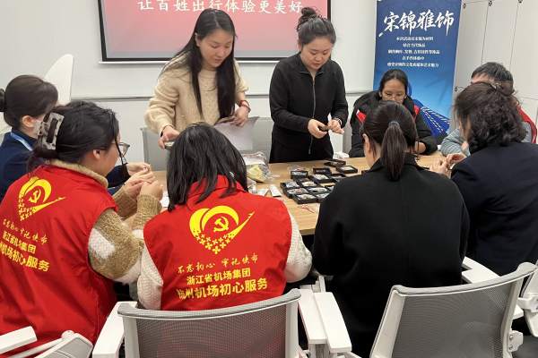 在緊張的服務工作之余,航站區中心也注重志愿者團隊的凝聚力建設。2月6日,特別聯合中國絲綢博物館舉辦“宋錦雅飾”手作活動,邀請站點工作人員及志愿者共同體驗宋錦胸針、掛飾等制作,在服務間隙放松身心、陶冶情趣,實現勞逸結合。