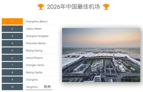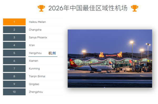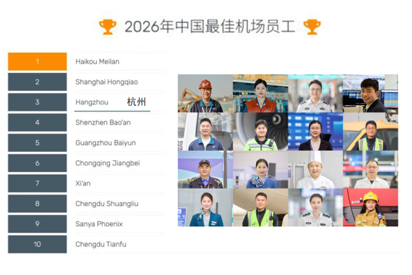3月18日,全球民航運輸服務品質認證機構Skytrax發布了2026年全球機場獎項結果。在此次公布的中國區5項獎項中,杭州機場獲獎4項,分別是“中國最佳機場”“中國最佳區域性機場”“中國最佳機場員工”“中國最佳機場酒店”。