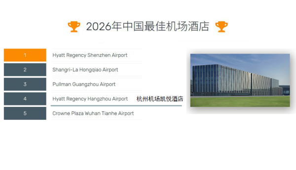杭州機場凱悅酒店深耕旅客出行與旅居需求,以匠心細節打磨有溫度、高品質的入住體驗,憑借優質服務與良好口碑首次登榜排名TOP4,彰顯了其過硬的機場配套服務實力。